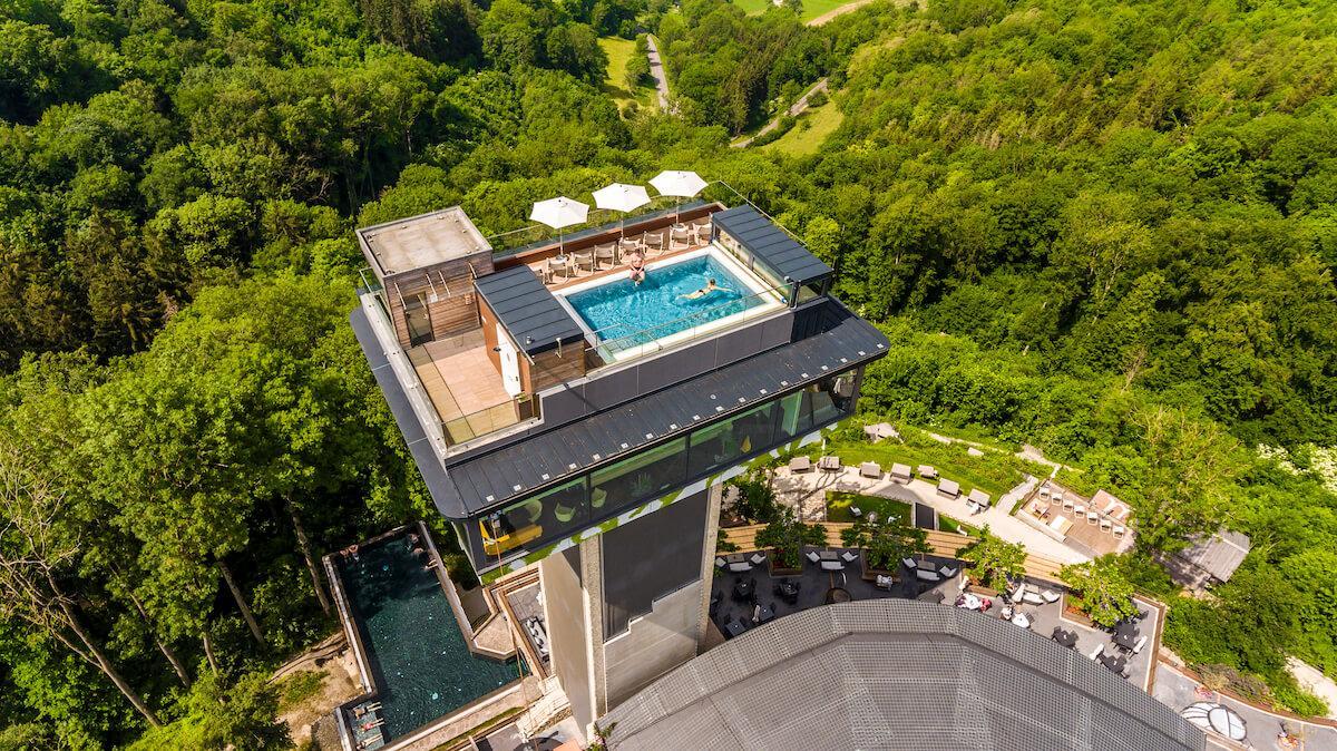 • Verwarmde Infinity-Waldpool met uitzicht tussen de bomen.